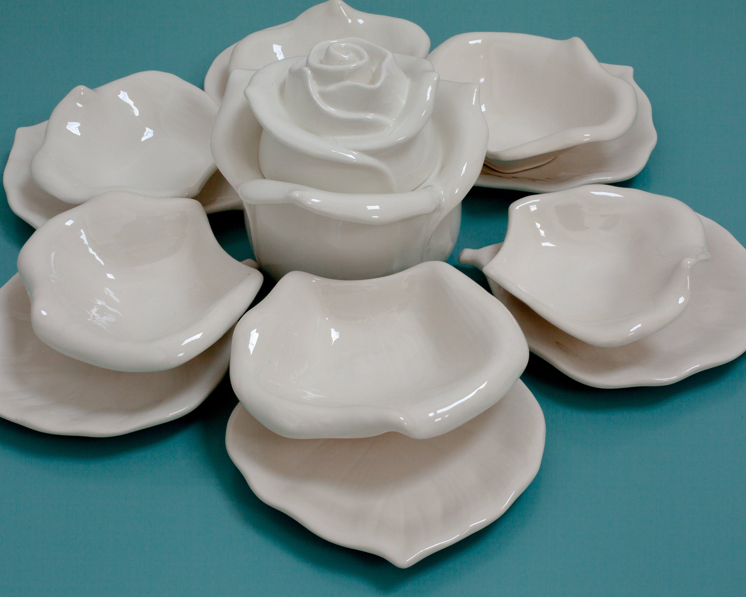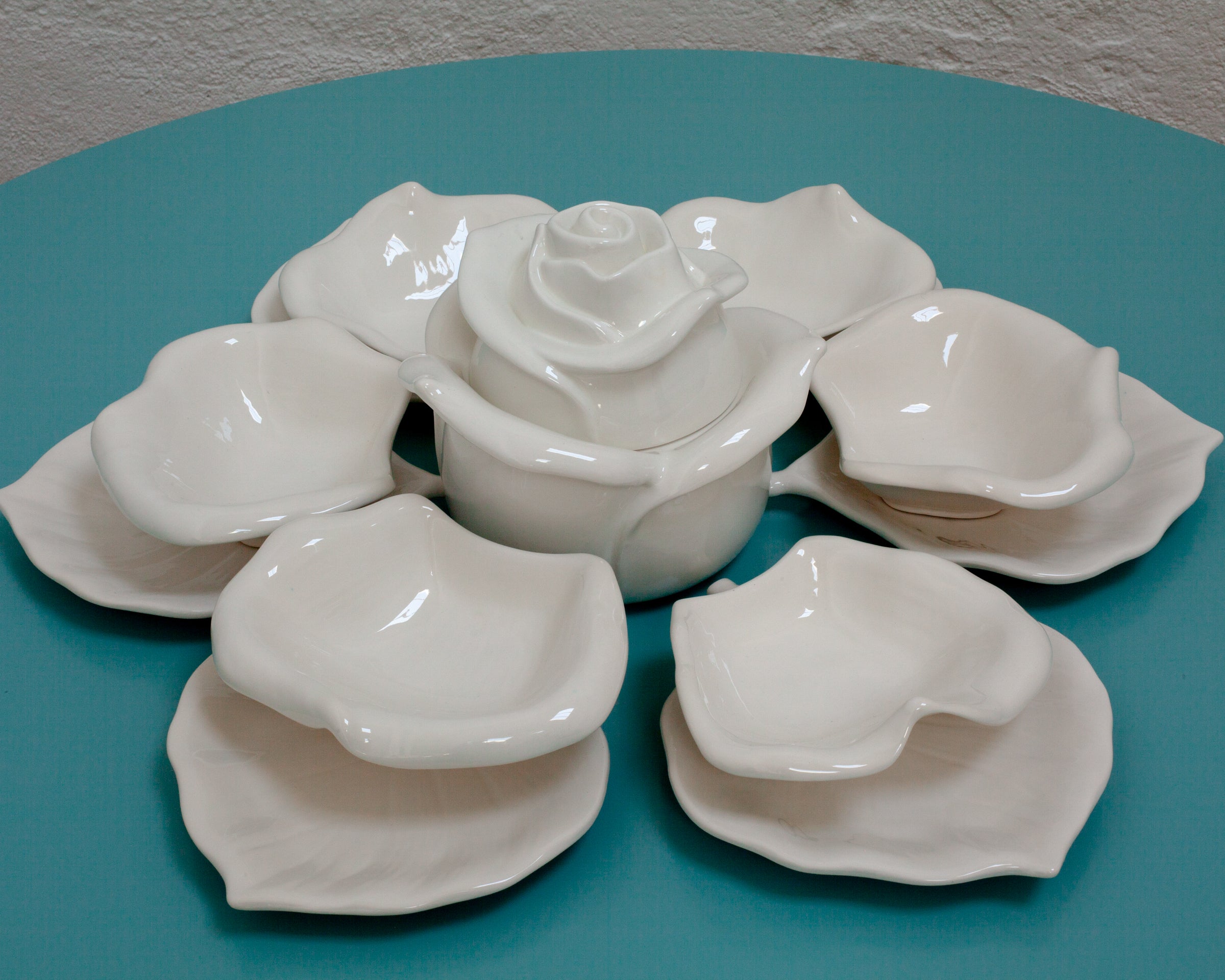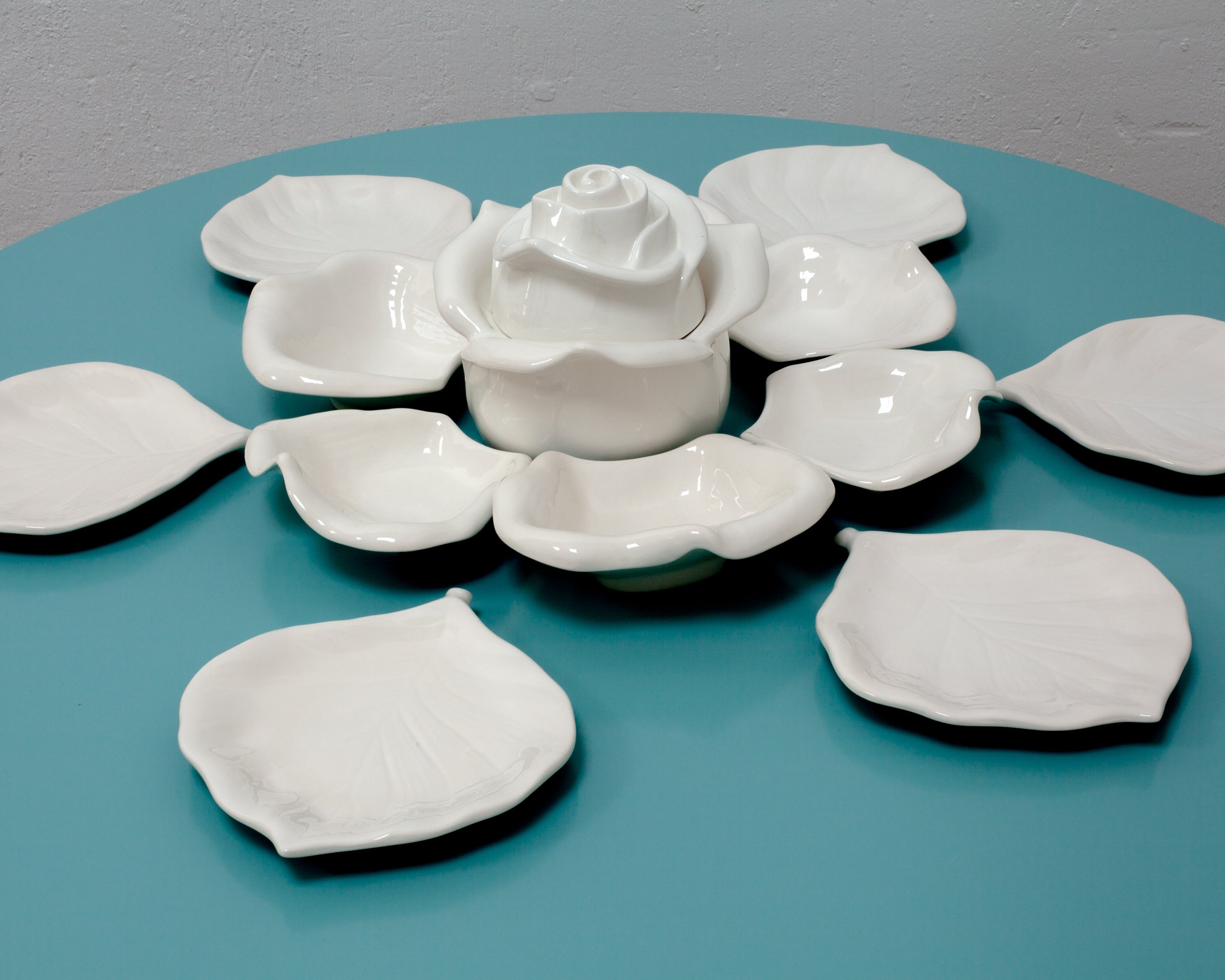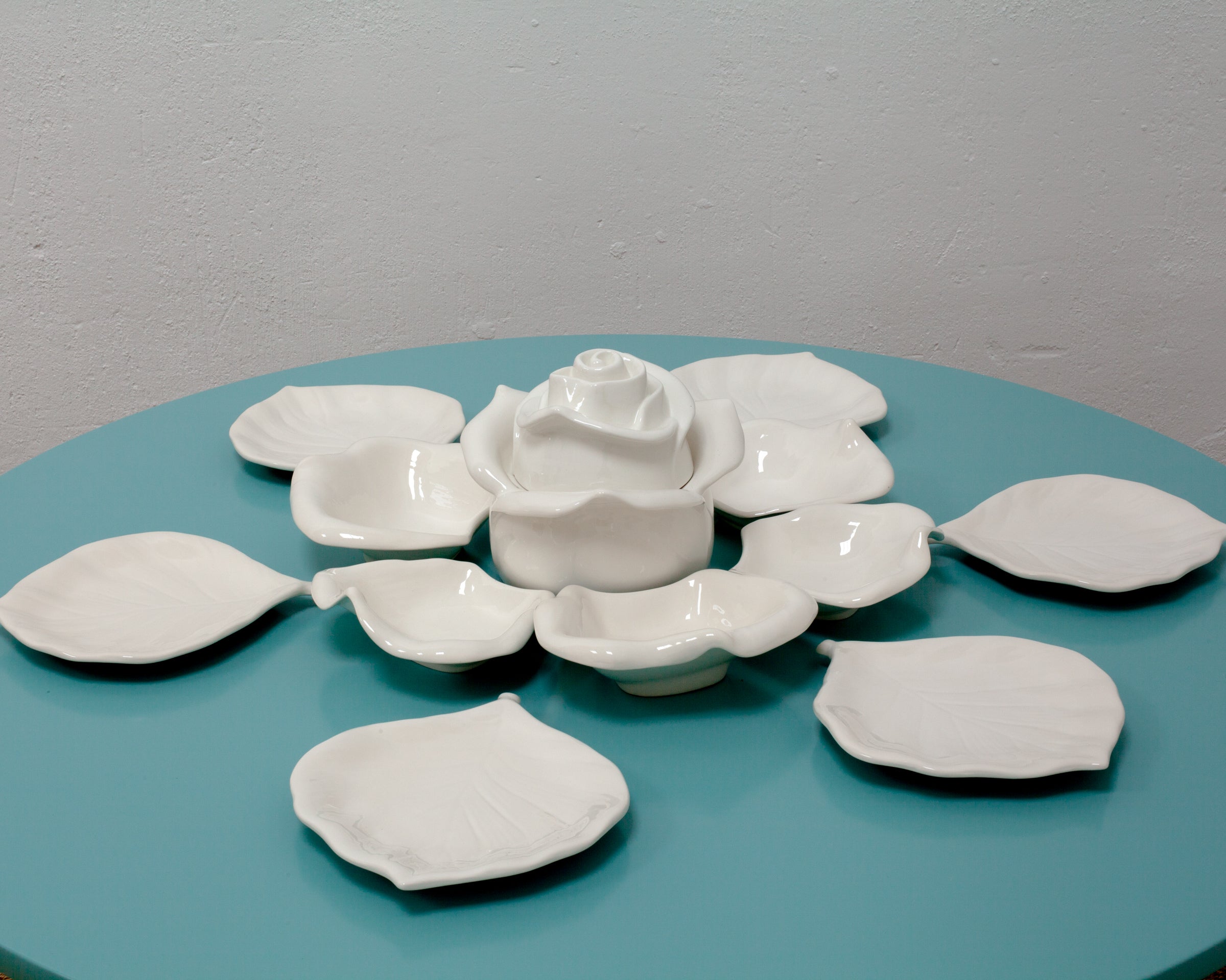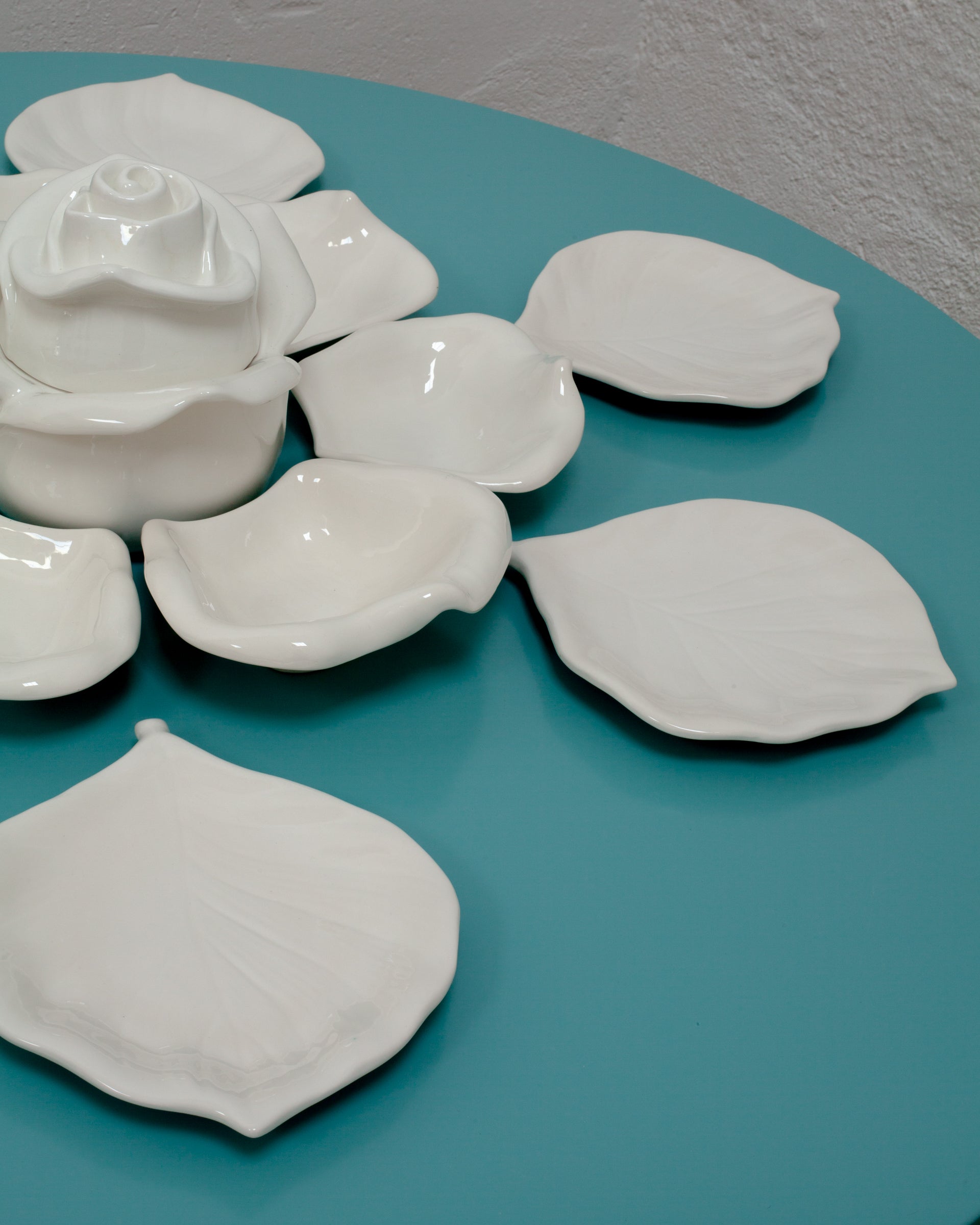 Elegante vajilla italiana de diseño contemporáneo compuesta por piezas de cerámica con bordes ondulados y formas orgánicas que evocan la delicadeza de los pétalos de una flor. Su estética fluida y asimétrica aporta un toque artístico y sofisticado a la mesa, convirtiendo cada presentación en una experiencia visual única.